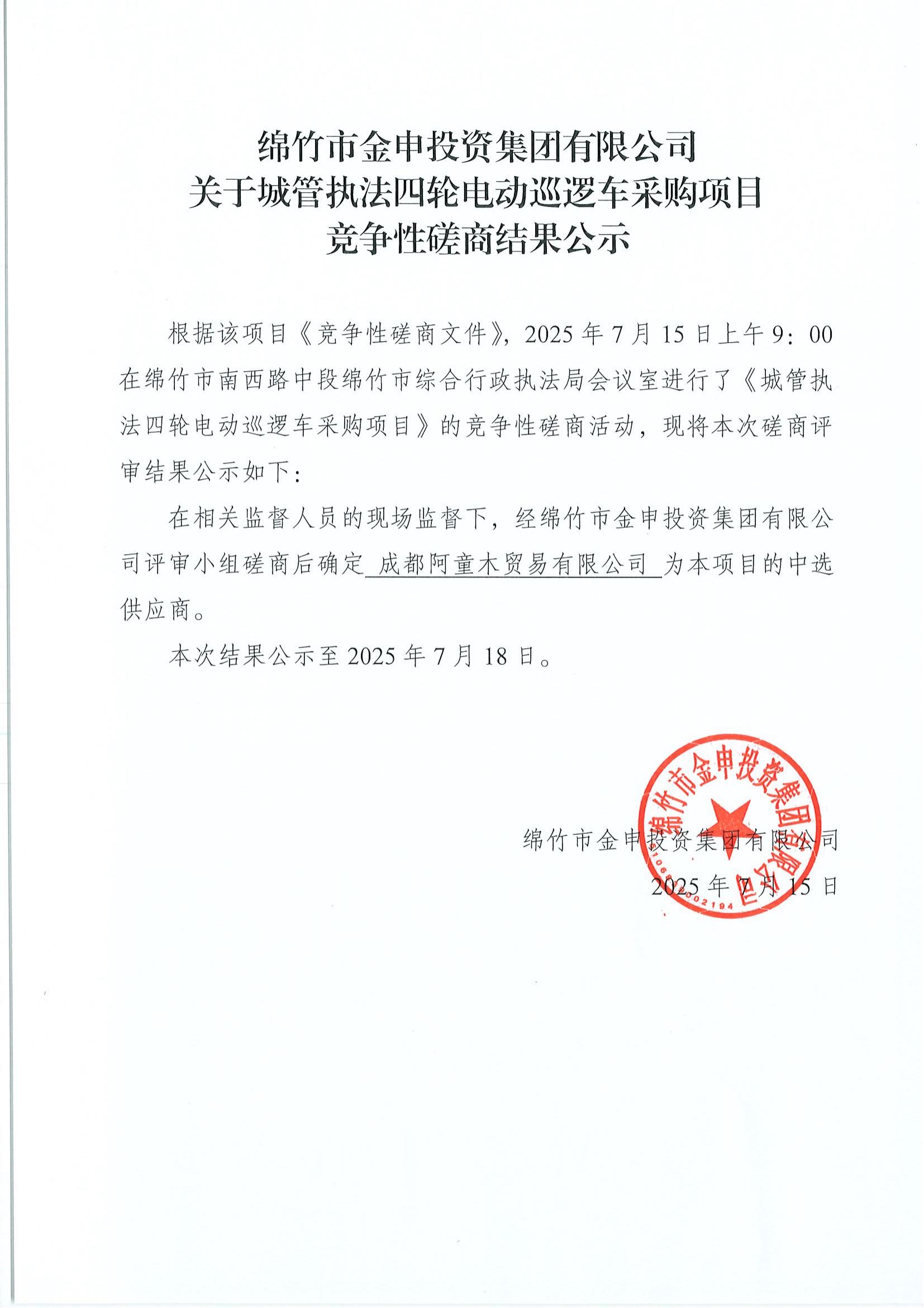 城管執(zhí)法四輪電動(dòng)巡邏車采購(gòu)項(xiàng)目競(jìng)爭(zhēng)性磋商結(jié)果公示