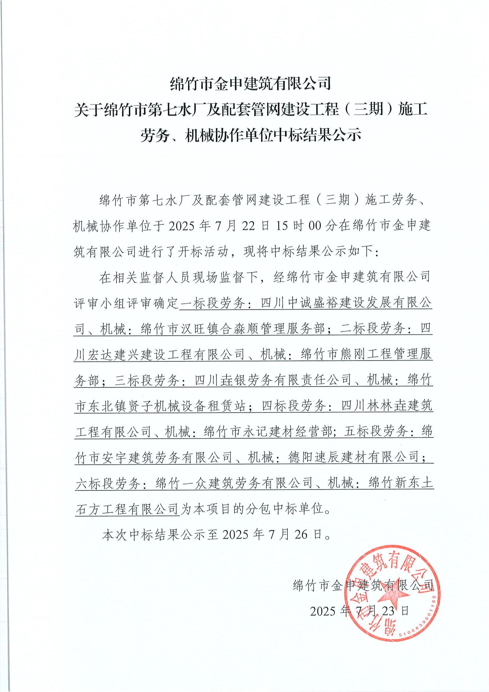 綿竹七水廠配套管網(wǎng)工程三期施工勞務(wù)機(jī)械中標(biāo)結(jié)果公示