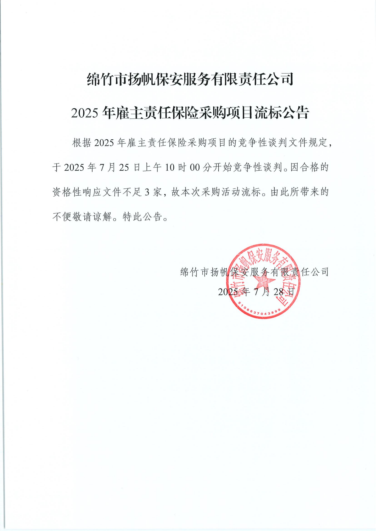 揚(yáng)帆保安2025年雇主責(zé)任保險(xiǎn)采購項(xiàng)目流標(biāo)公告