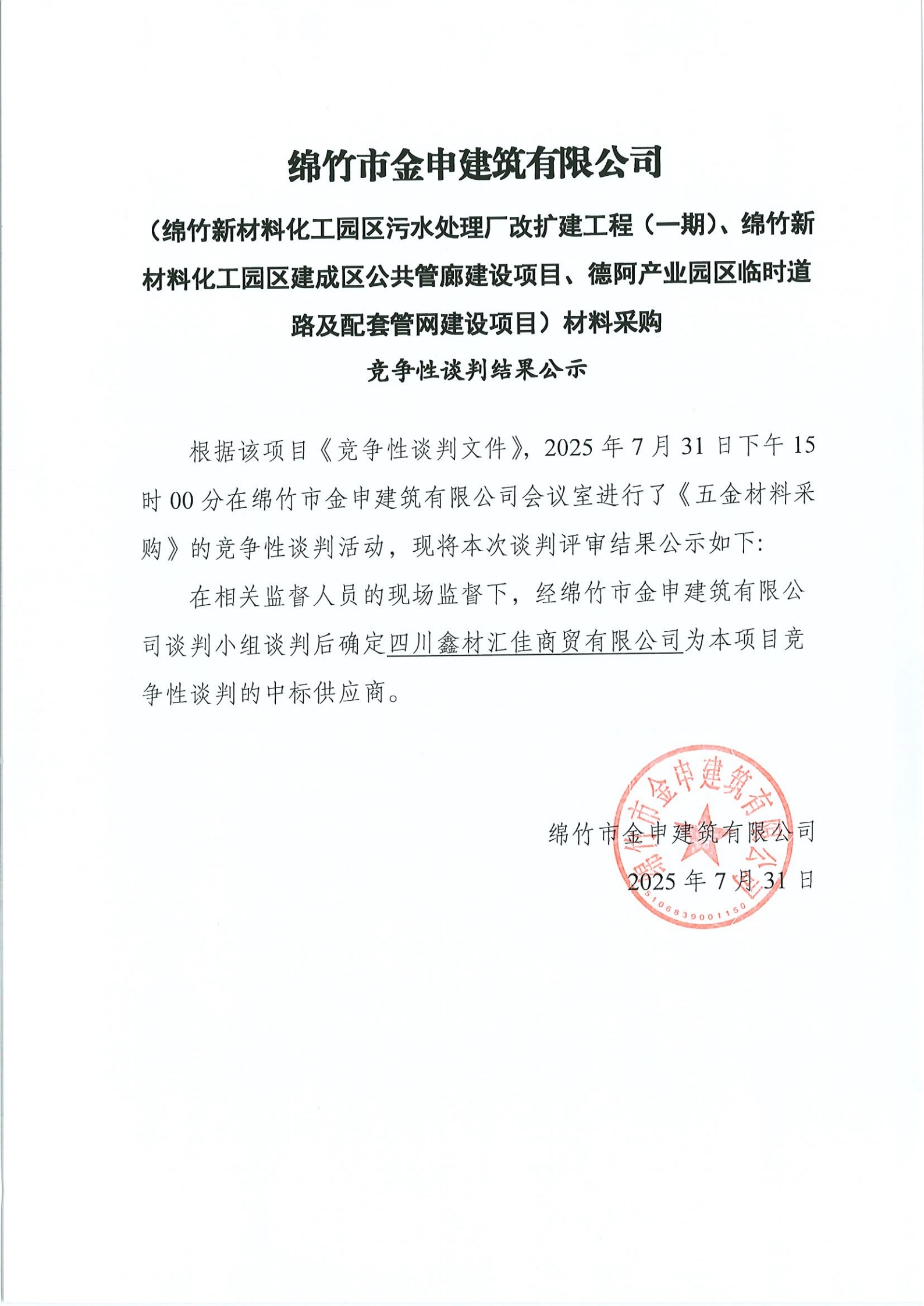 污水廠、公共管廊、德阿產(chǎn)業(yè)園(五金)材料中標結(jié)果公示
