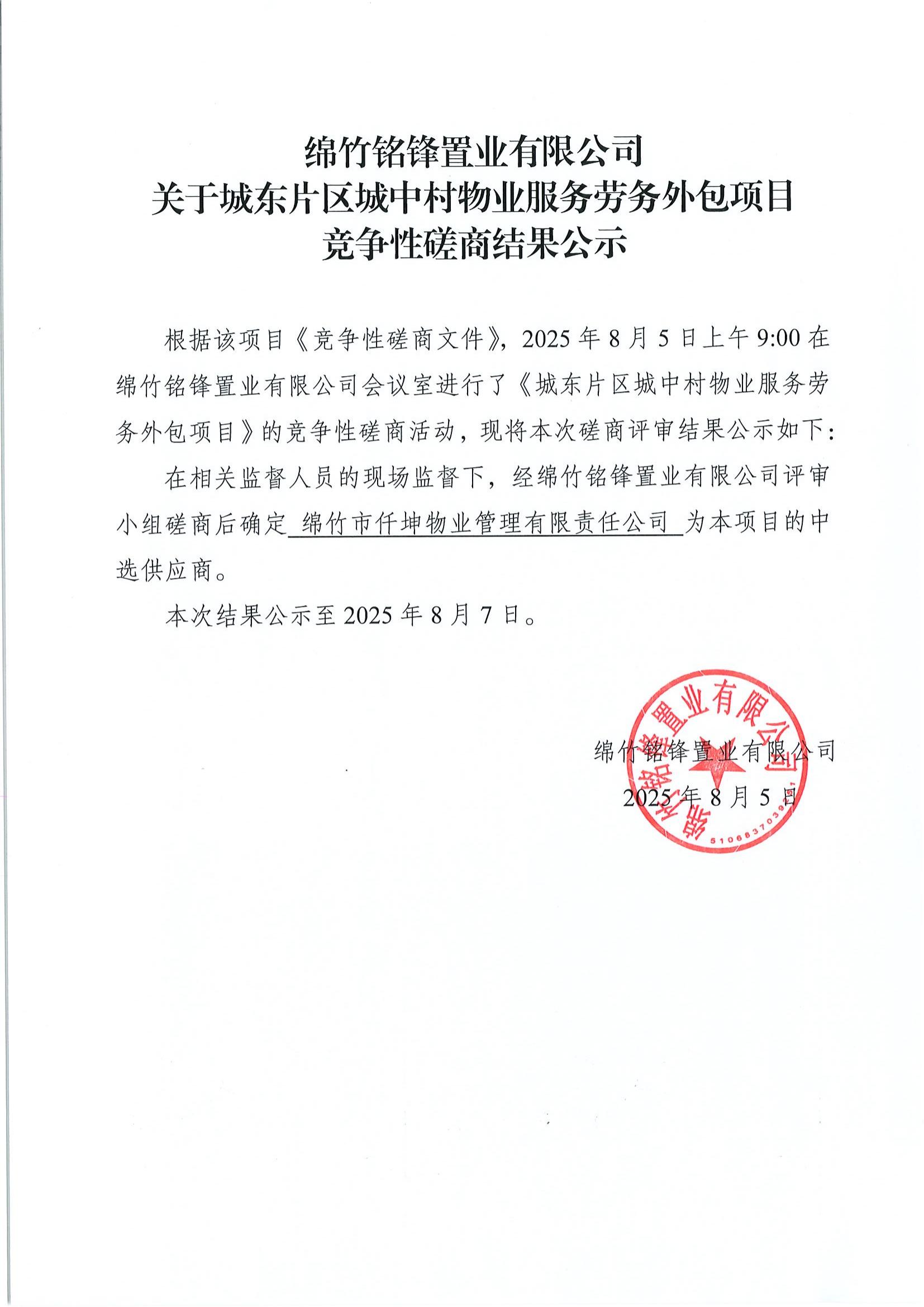 關(guān)于城東片區(qū)城中村物業(yè)服務(wù)勞務(wù)外包項(xiàng)目磋商結(jié)果公示