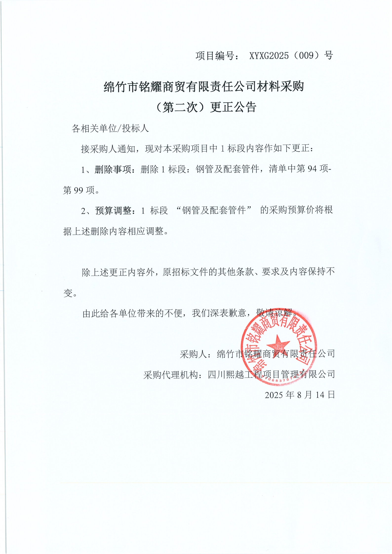 銘耀商貿(mào)材料采購(第二次)更正公告