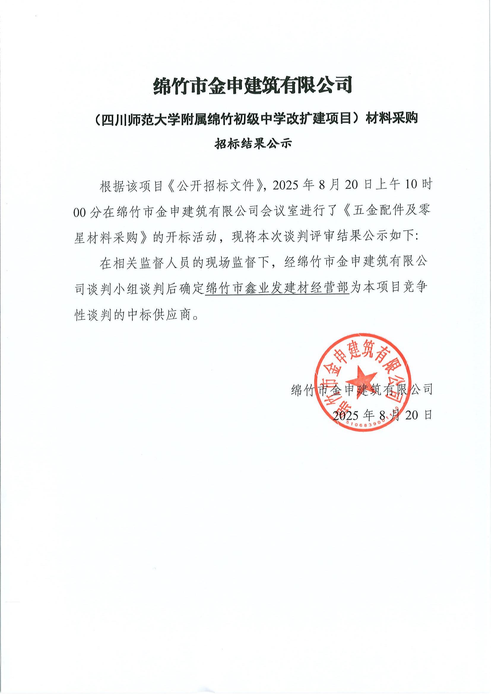川師附中(五金材料)材料采購(gòu)競(jìng)爭(zhēng)性談判結(jié)果公示