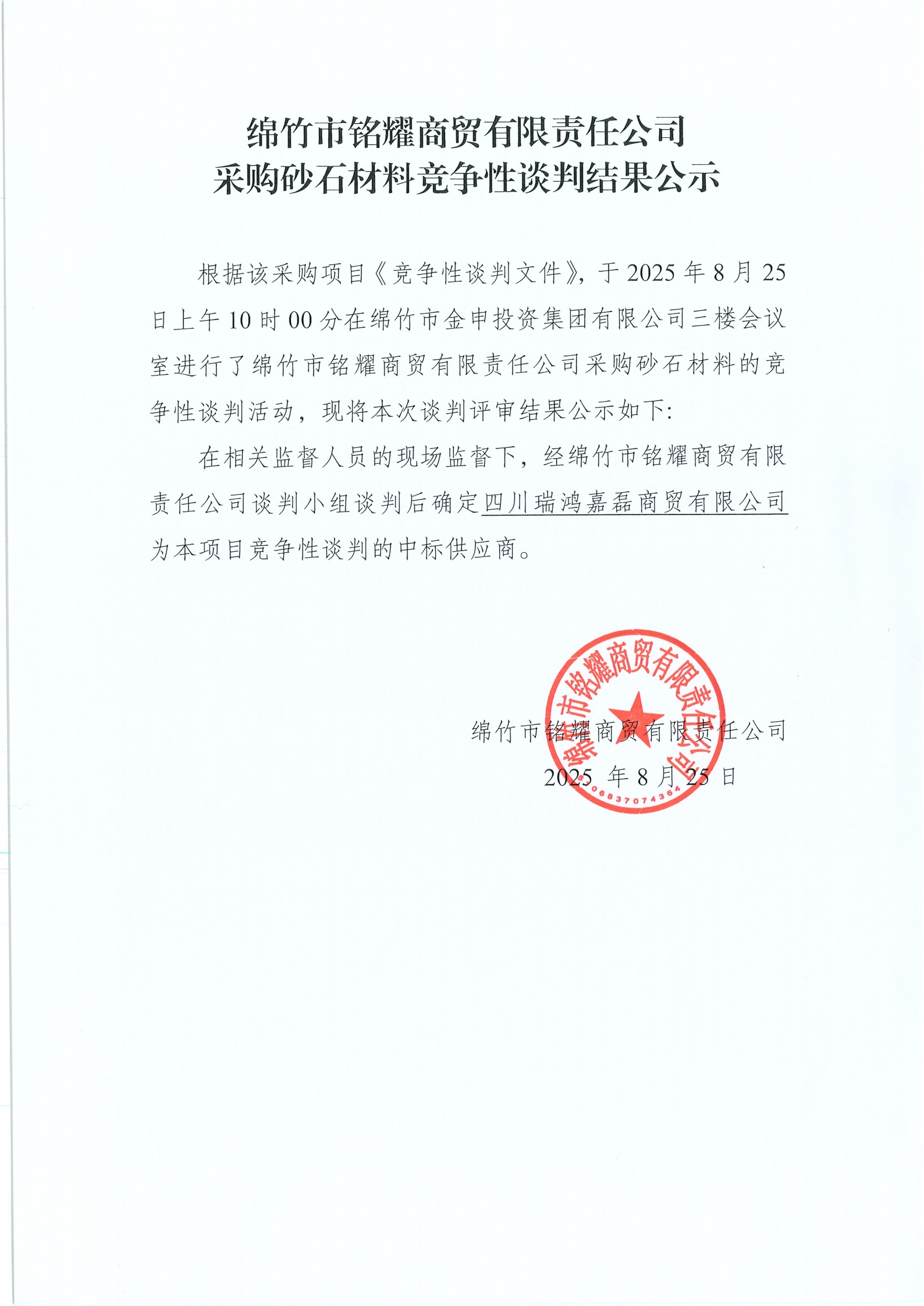 銘耀商貿(mào)采購(gòu)砂石材料競(jìng)爭(zhēng)性談判結(jié)果公示
