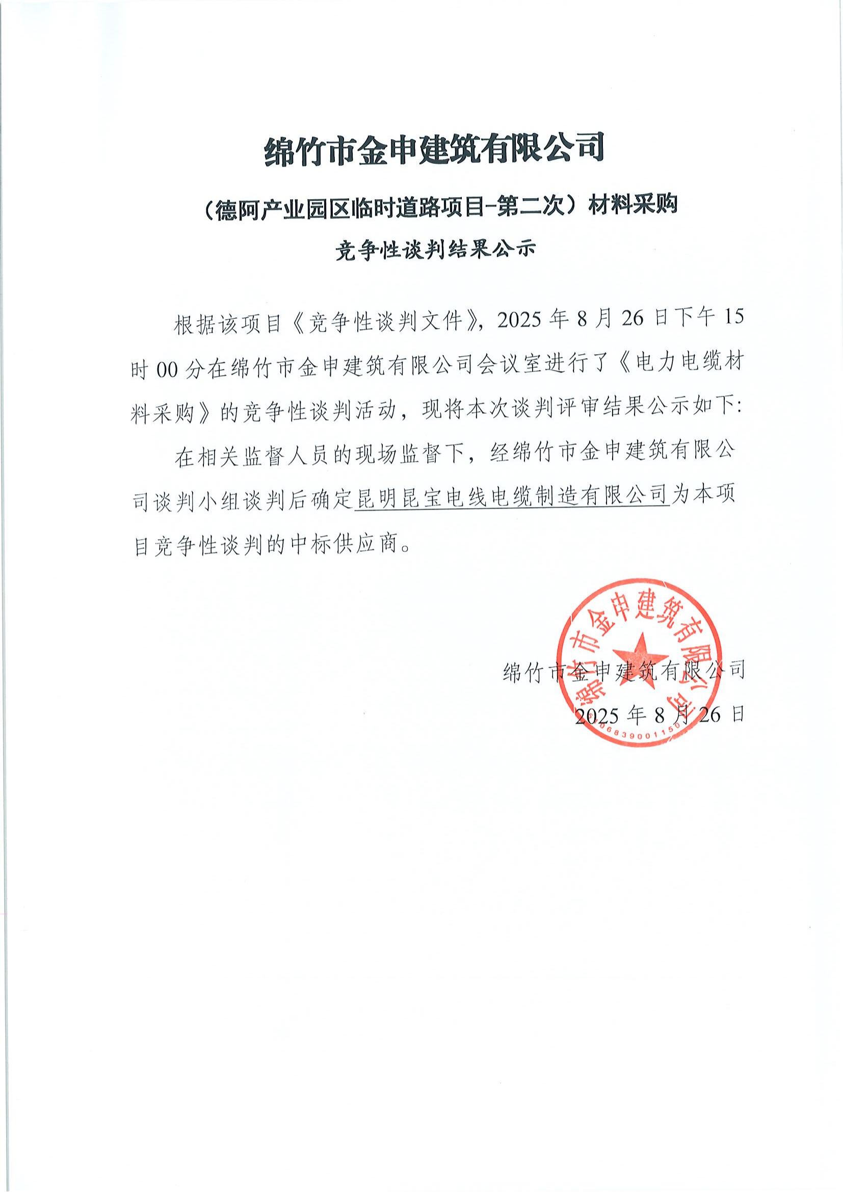 德阿產(chǎn)業(yè)園臨時道路電力電纜材料采購競爭性談判結果公示