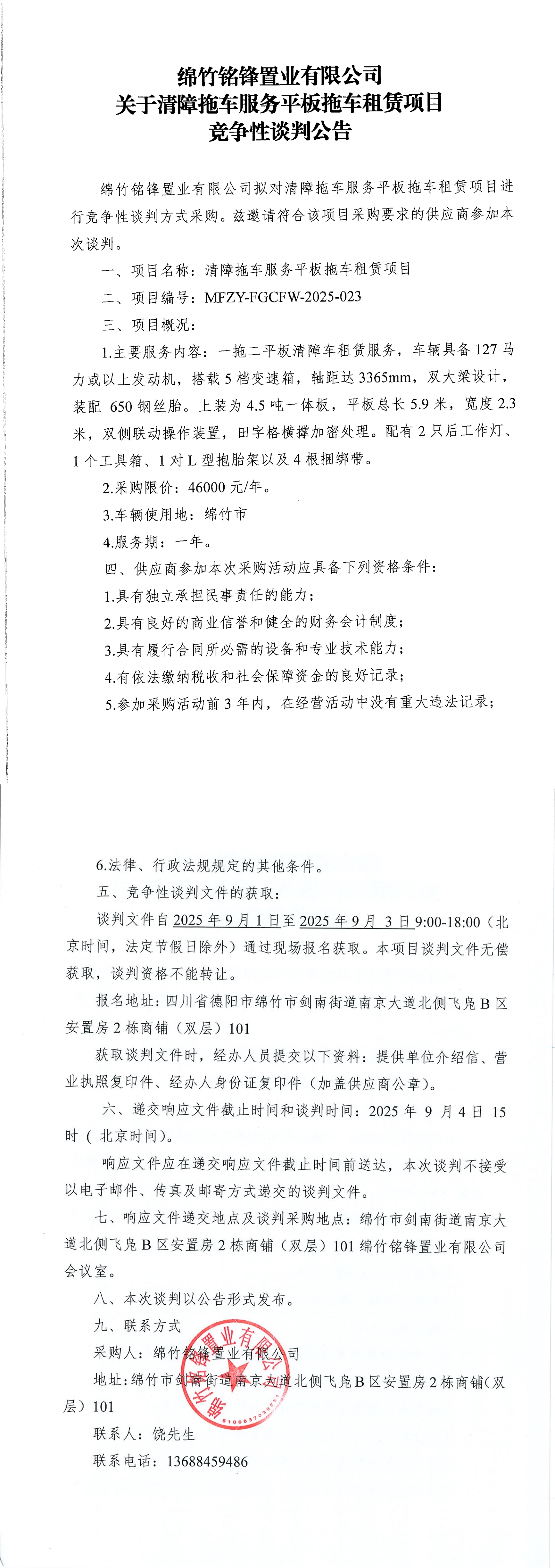 清障拖車服務(wù)平板拖車租賃項(xiàng)目競爭性談判公告