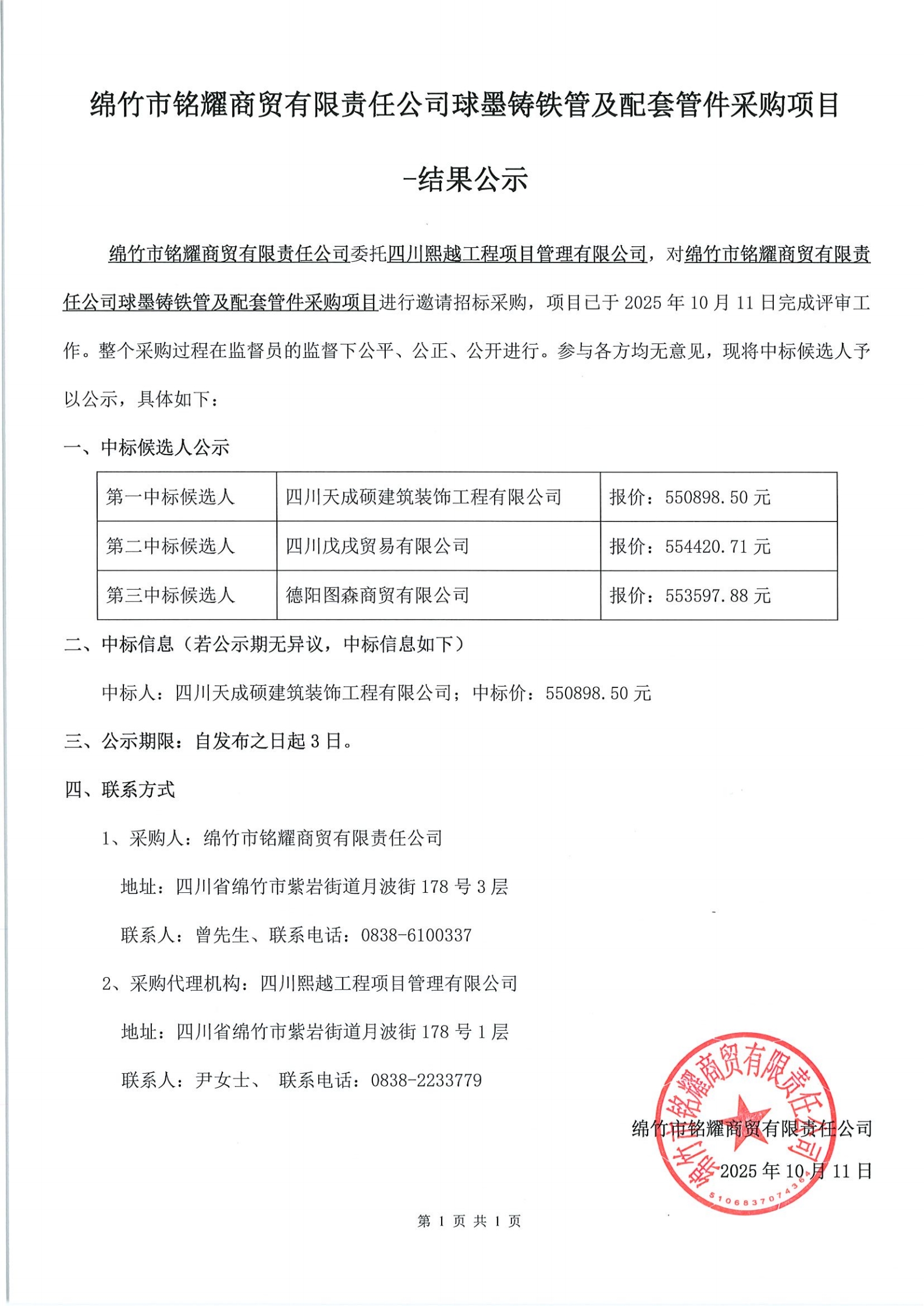 銘耀商貿(mào)球墨鑄鐵管及配套管件采購(gòu)項(xiàng)目結(jié)果公示