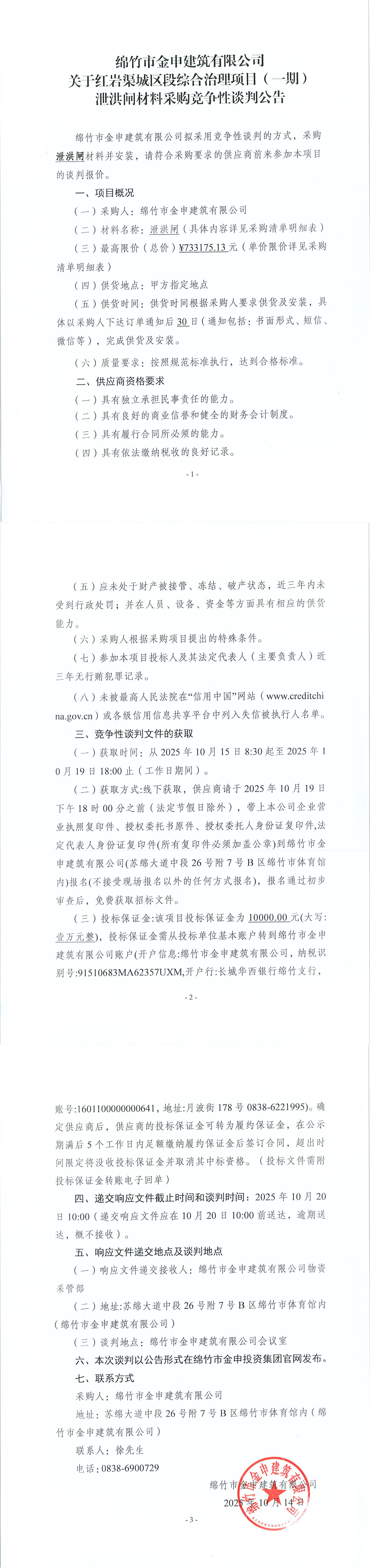 關(guān)于紅巖渠一期(泄洪閘)材料采購競爭性談判公告
