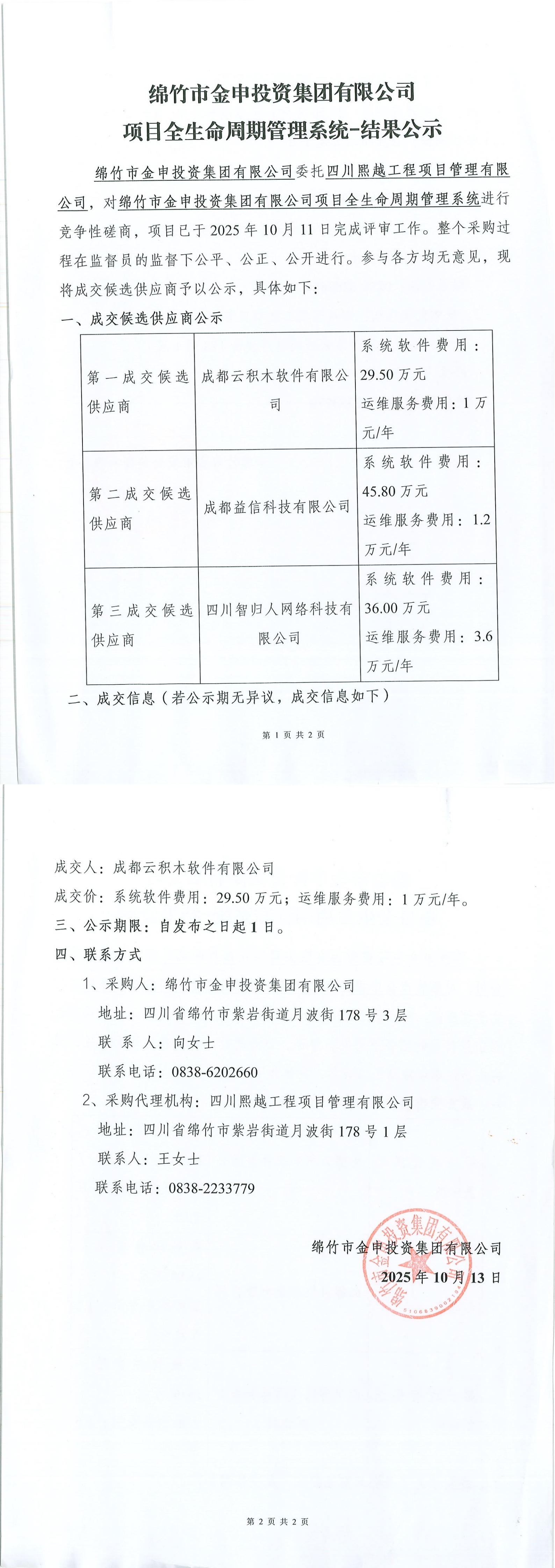綿竹市金申投資集團(tuán)有限公司項(xiàng)目全生命周期管理系統(tǒng)結(jié)果公示