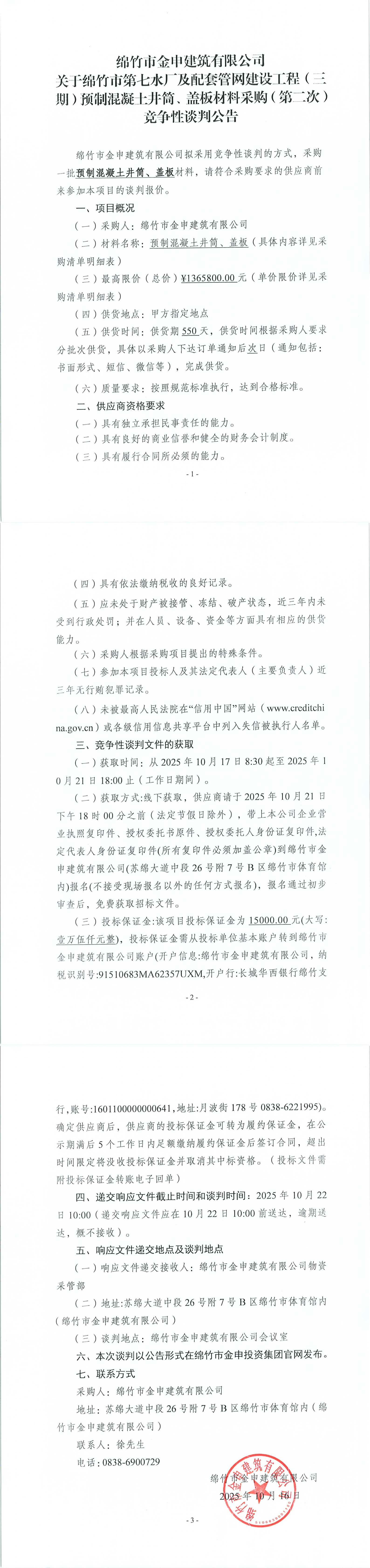 關(guān)于七水廠一期預(yù)制混凝土井筒、蓋板材料采購(第二次)競(jìng)爭性談判公告