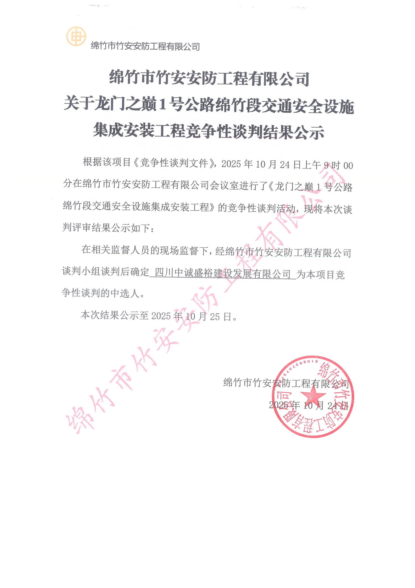 竹安安防關(guān)于龍門之巔1號公路綿竹段交通安全設(shè)施集成安裝工程競爭性談判結(jié)果公示
