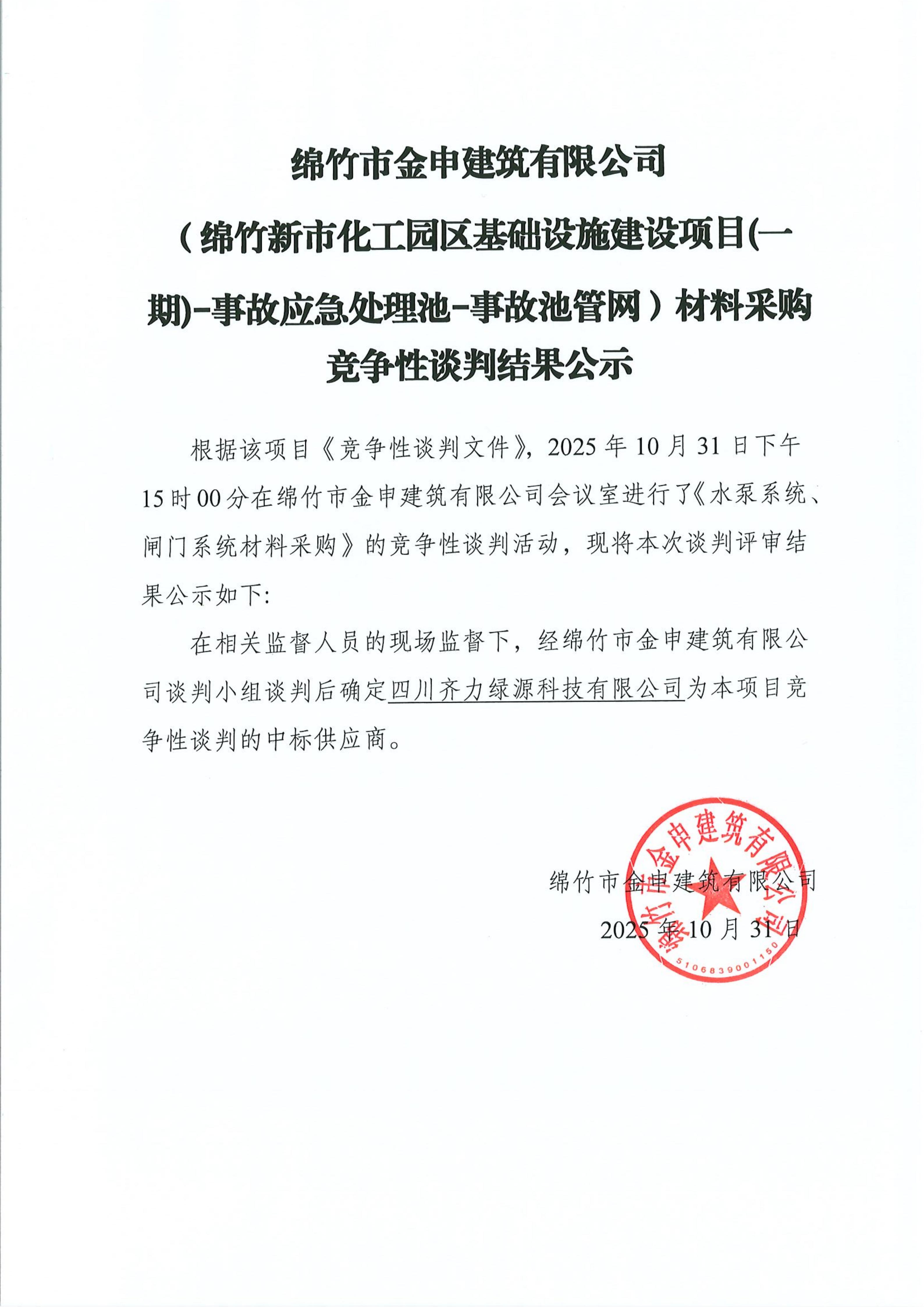 關(guān)于綿竹市新市化工園區(qū)事故池管網(wǎng)(水泵系統(tǒng)、閘門系統(tǒng))材料采購競爭性談判結(jié)果公示
