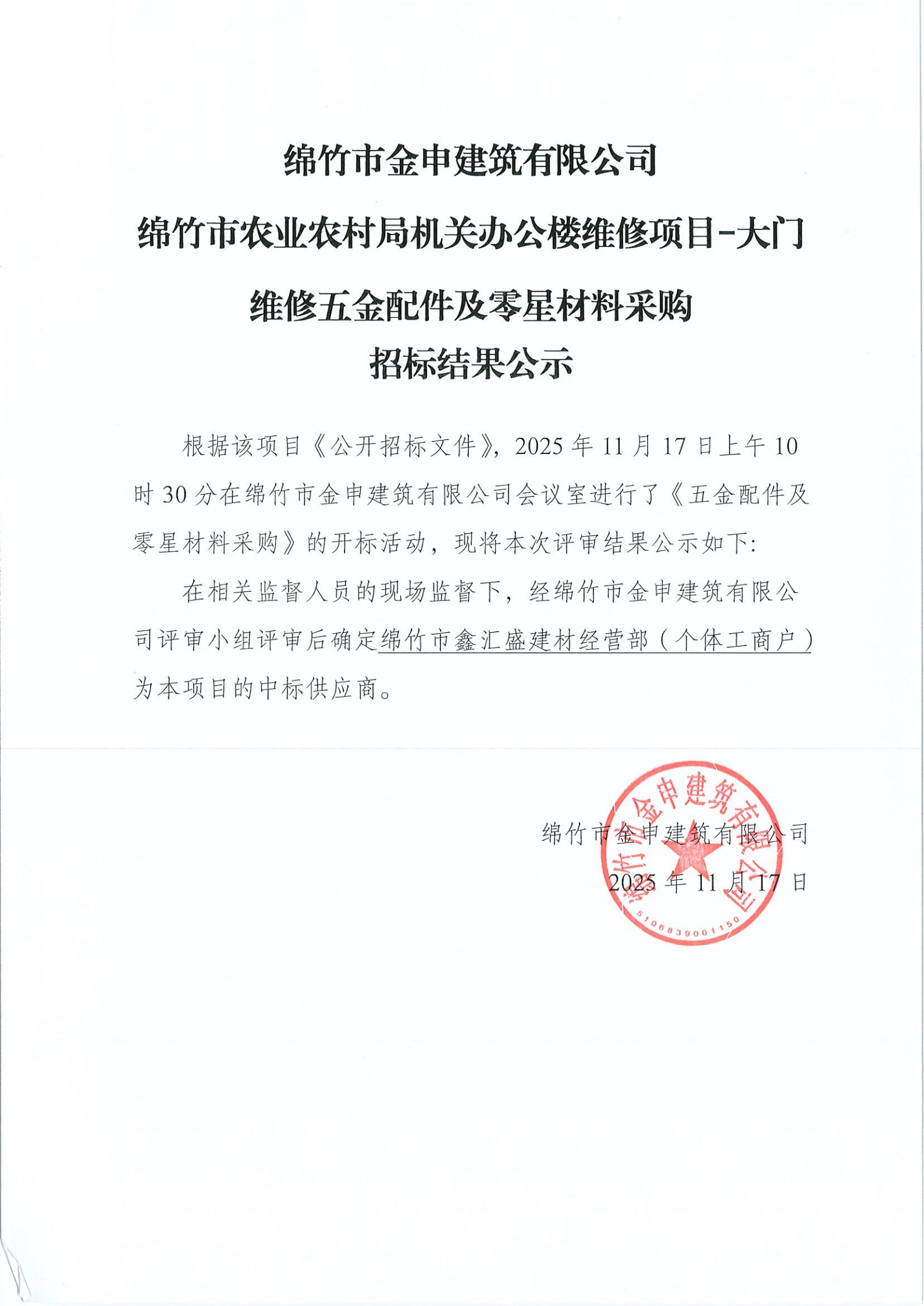 關(guān)于農(nóng)業(yè)農(nóng)村局辦公樓維修項目(五金配件及零星材料)采購招標(biāo)結(jié)果公示