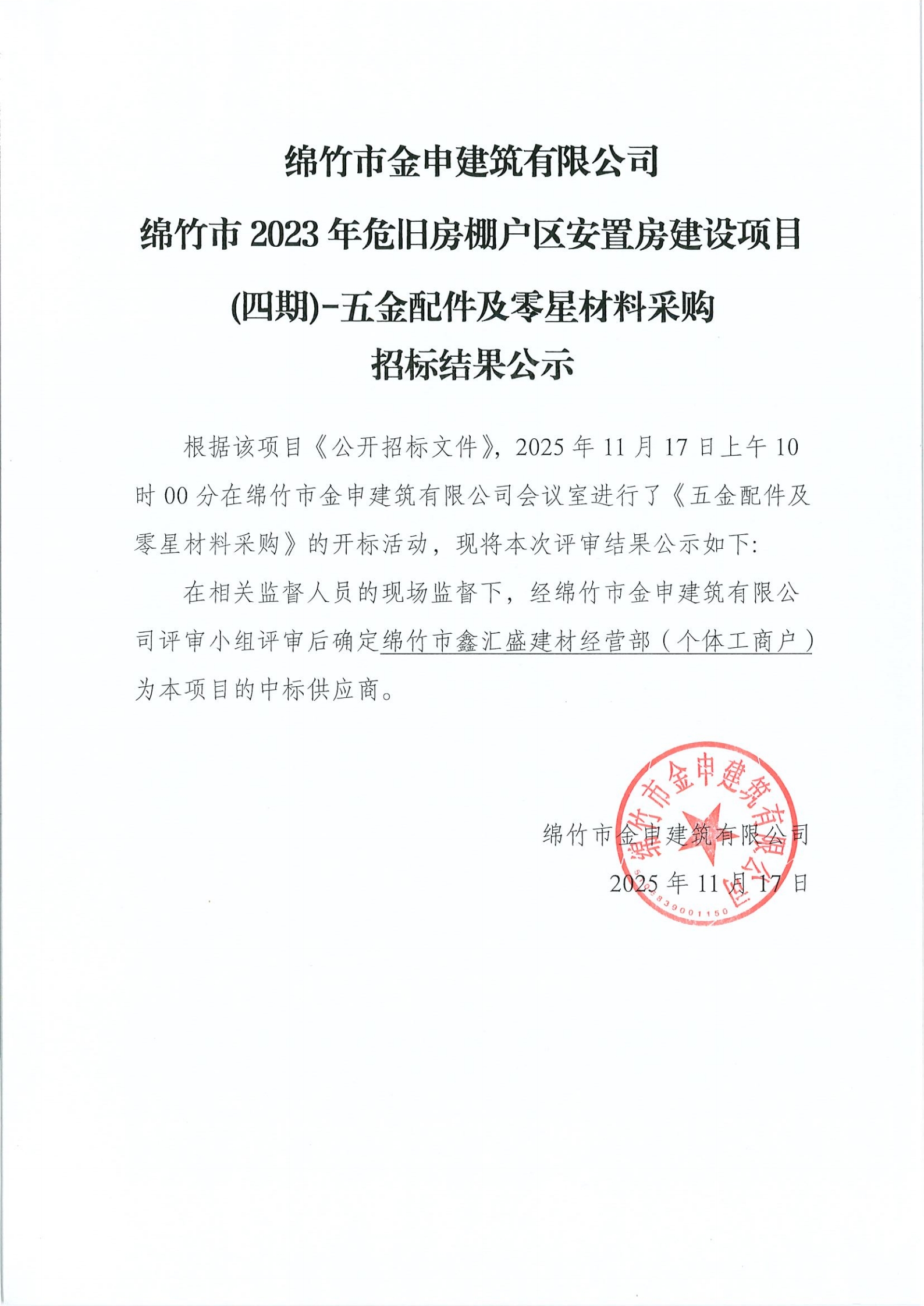 關(guān)于棚改四期項目(五金配件及零星材料)采購招標(biāo)結(jié)果公示