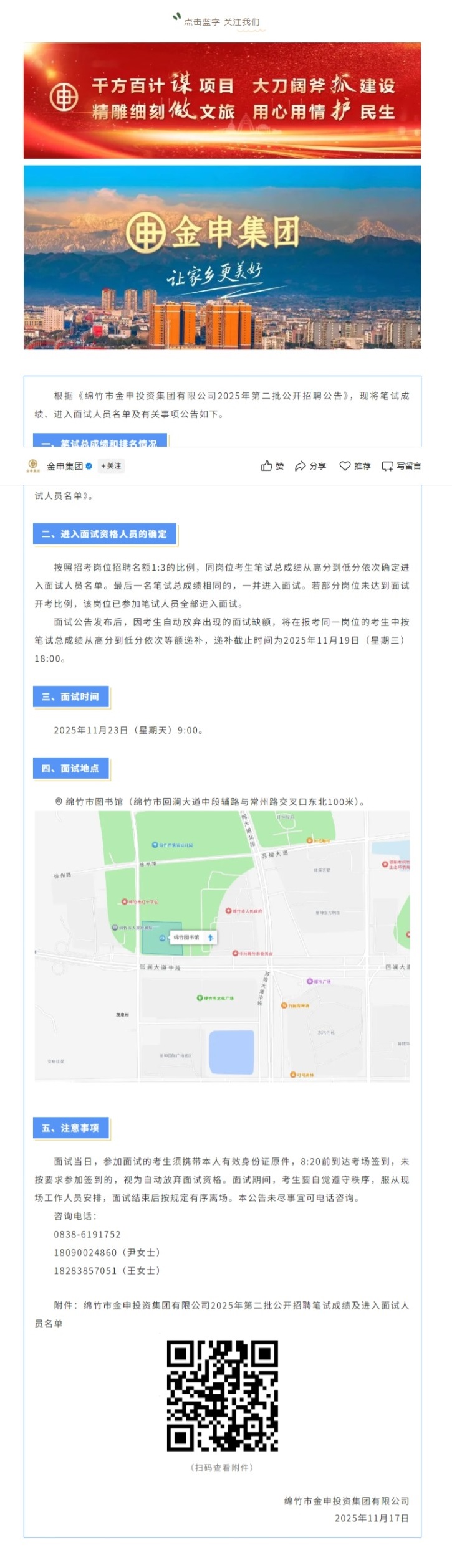 綿竹市金申投資集團(tuán)有限公司2025年第二批公開招聘筆試成績及進(jìn)入面試人員名單的公告