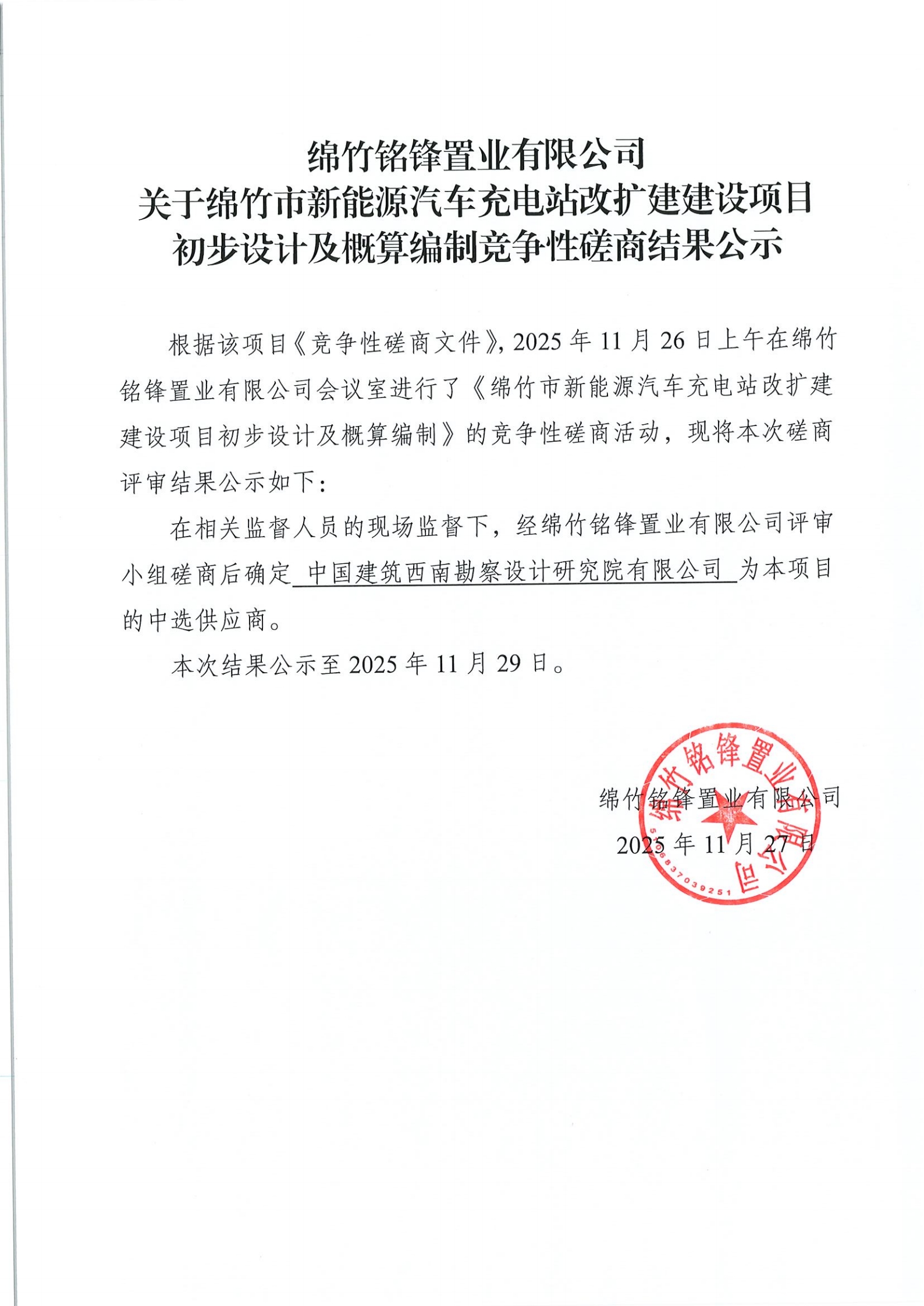 關于綿竹市新能源汽車充電站改擴建建設項目初步設計及概算編制競爭性磋商結果公示