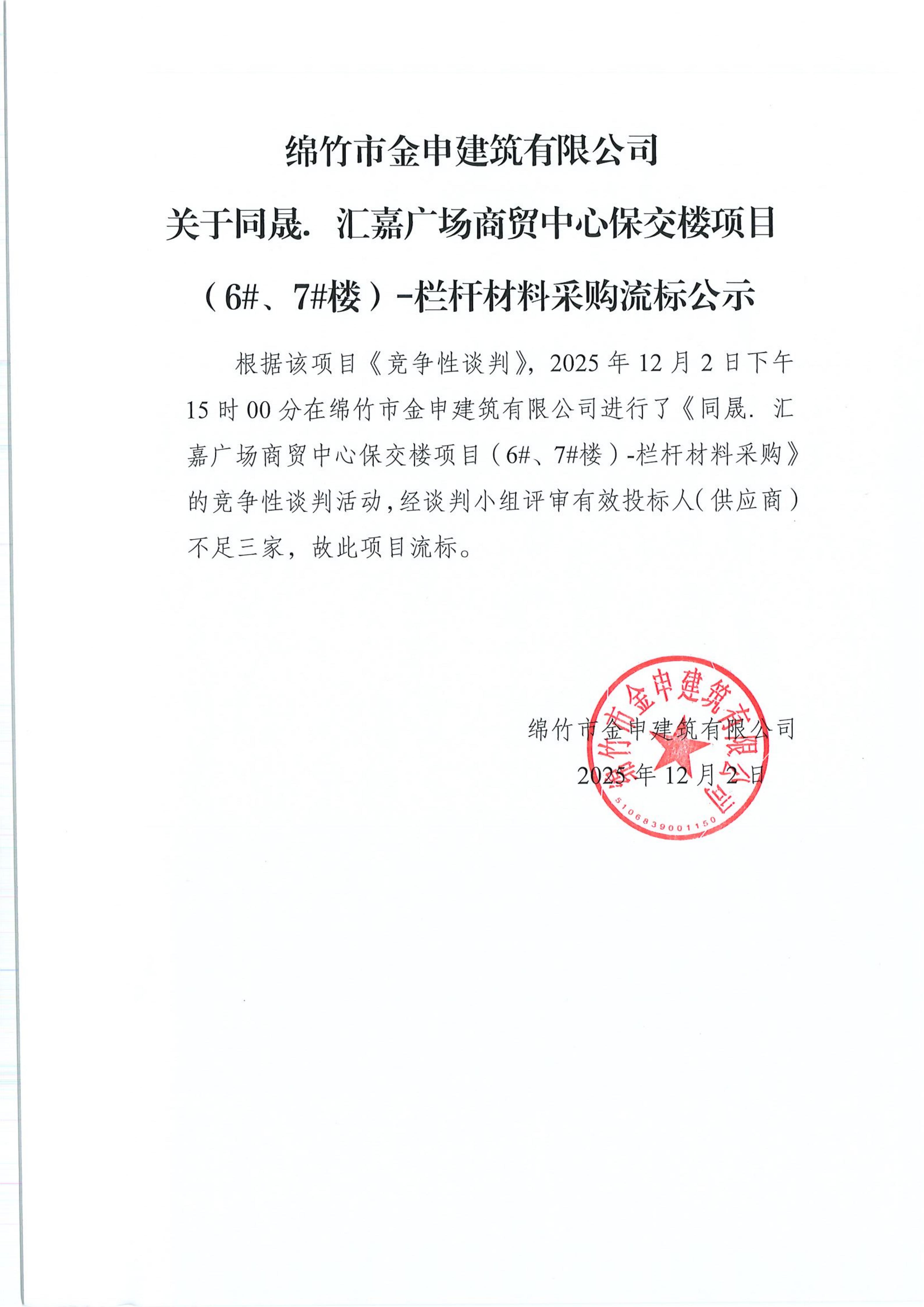 關(guān)于同晟匯嘉廣場(chǎng)欄桿材料采購流標(biāo)公告