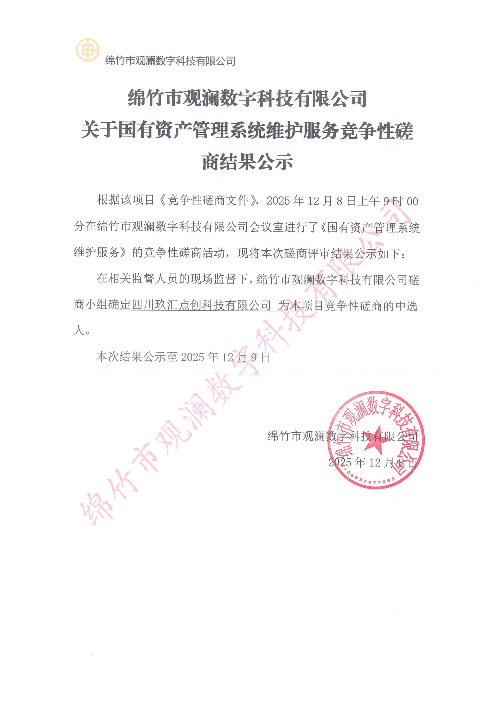 綿竹市觀瀾數(shù)字科技有限公司關(guān)于國有資產(chǎn)管理系統(tǒng)維護(hù)服務(wù)競爭性磋商結(jié)果公示