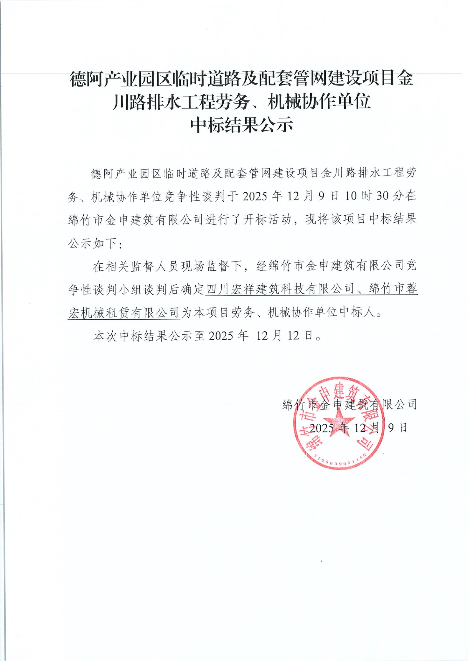 德阿產業(yè)園區(qū)臨時道路及配套管網建設項目金川路排水工程勞務、機械協作單位中標結果公示
