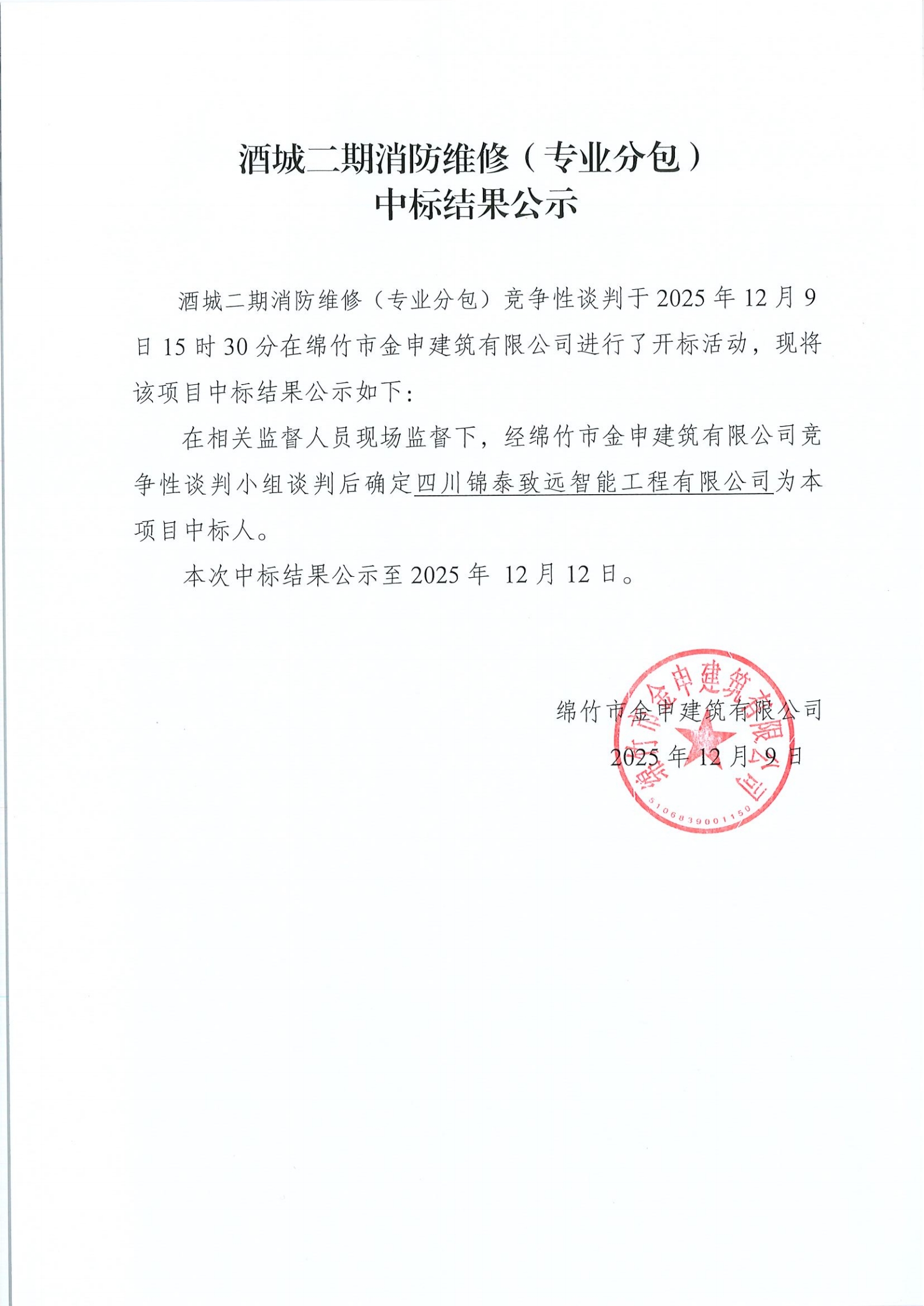 酒城二期消防維修(專業(yè)分包)中標(biāo)結(jié)果公示