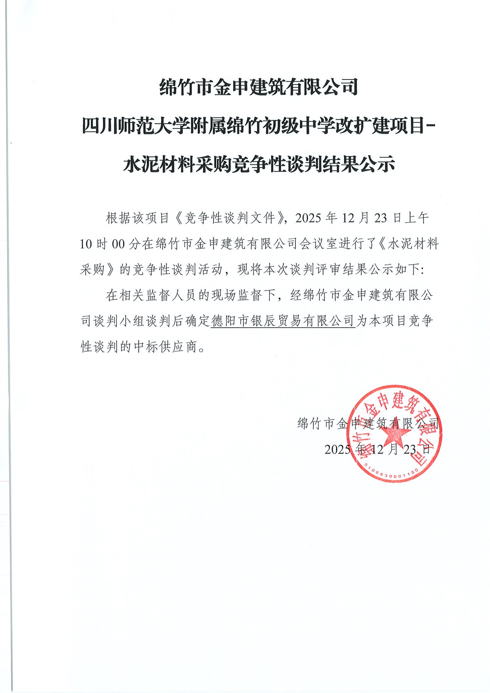 川師附中改擴建項目- 水泥材料采購競爭性談判結(jié)果公示
