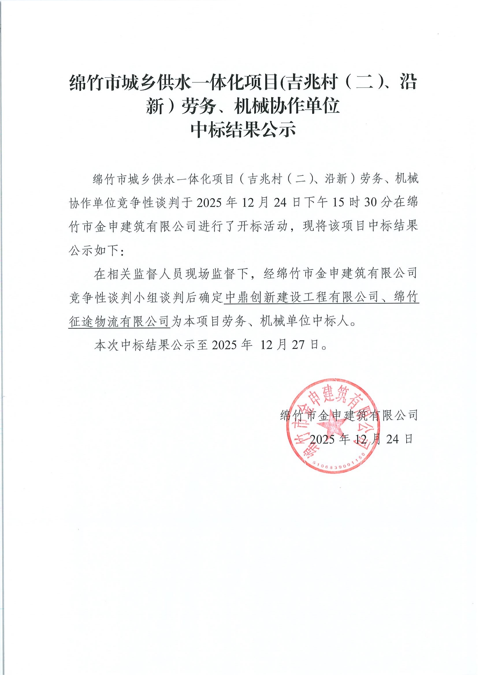 綿竹市城鄉(xiāng)供水一體化項(xiàng)目(吉兆村(二)、沿新)勞務(wù)、機(jī)械協(xié)作單位中標(biāo)結(jié)果公示