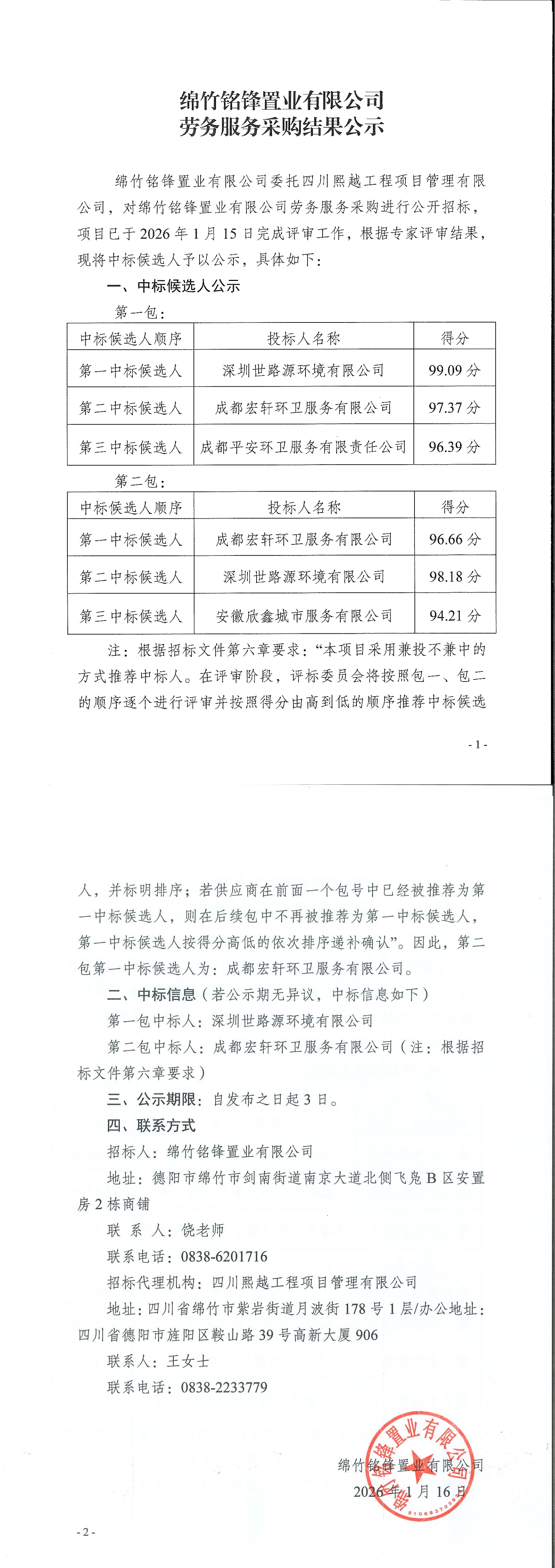 綿竹銘鋒置業(yè)有限公司勞務(wù)服務(wù)采購結(jié)果公示