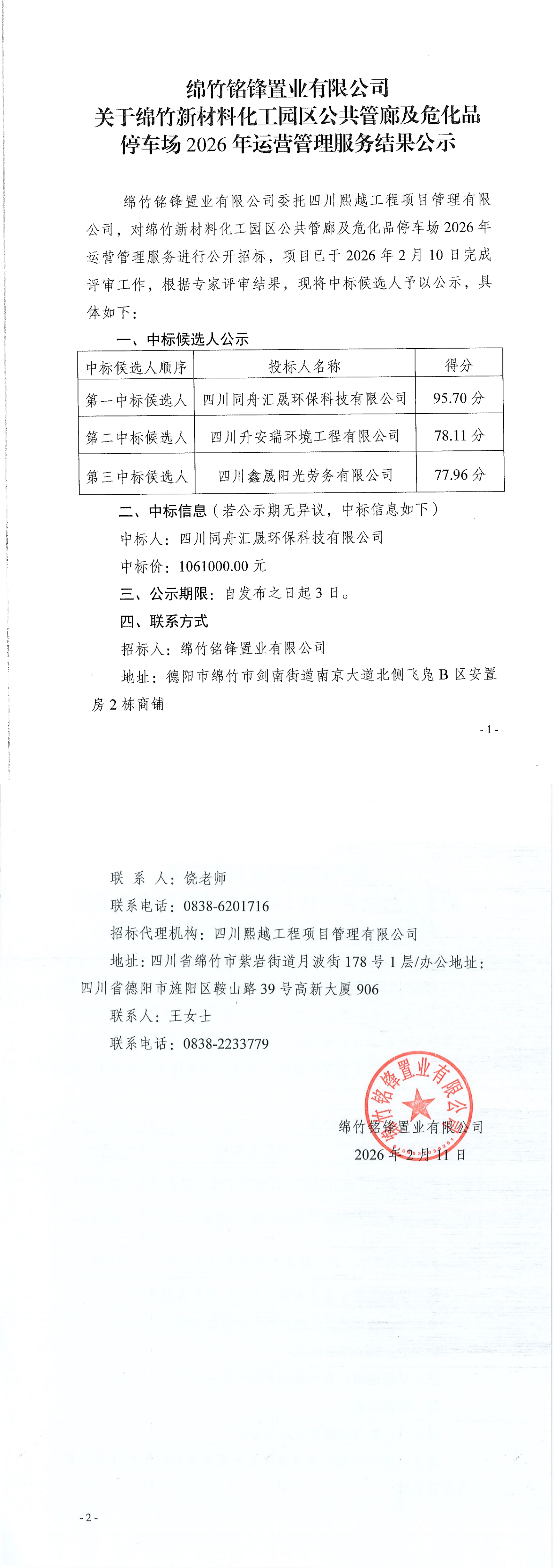 銘鋒置業(yè)關(guān)于綿竹新材料化工園區(qū)公共管廊及?;吠\噲?026年運營管理服務(wù)結(jié)果公示