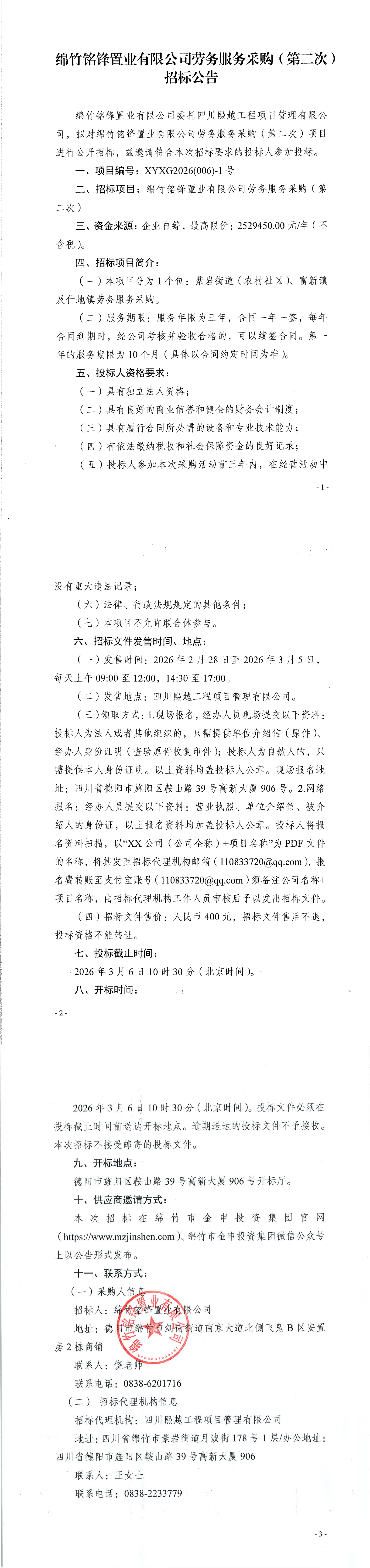 綿竹銘鋒置業(yè)有限公司勞務(wù)服務(wù)采購(第二次)招標公告