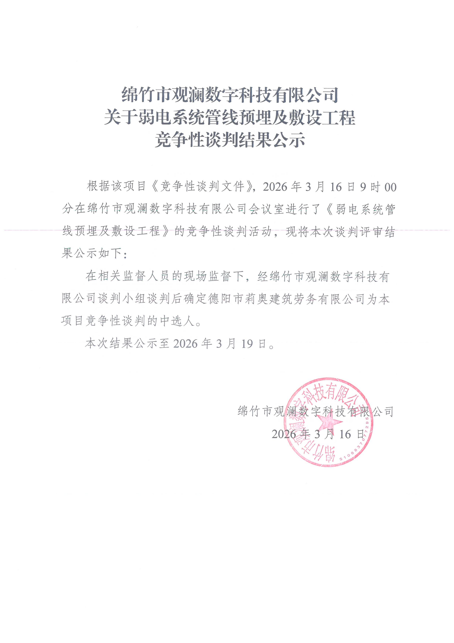 觀瀾數(shù)科關(guān)于弱電系統(tǒng)管線預(yù)埋及敷設(shè)工程競(jìng)爭(zhēng)性談判結(jié)果公示